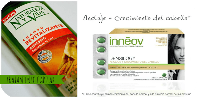 * Yo ya he cambiado mi rutina capilar para paliar la caída del cabello. Llevo semanas utilizando el champú de Naturaleza y vida revitalizante, a base de ginseng (sin siliconas, parabenos…e hipoalergénico..etc) con el que estoy muy contenta y tomando el nuevo tratamiento de Inneov, Densilogy, a base de Omega 3, Zinc y vitamina D para favorecer el crecimiento y anclaje capilar. Válido a su vez para uñas frágiles y quebradizas.