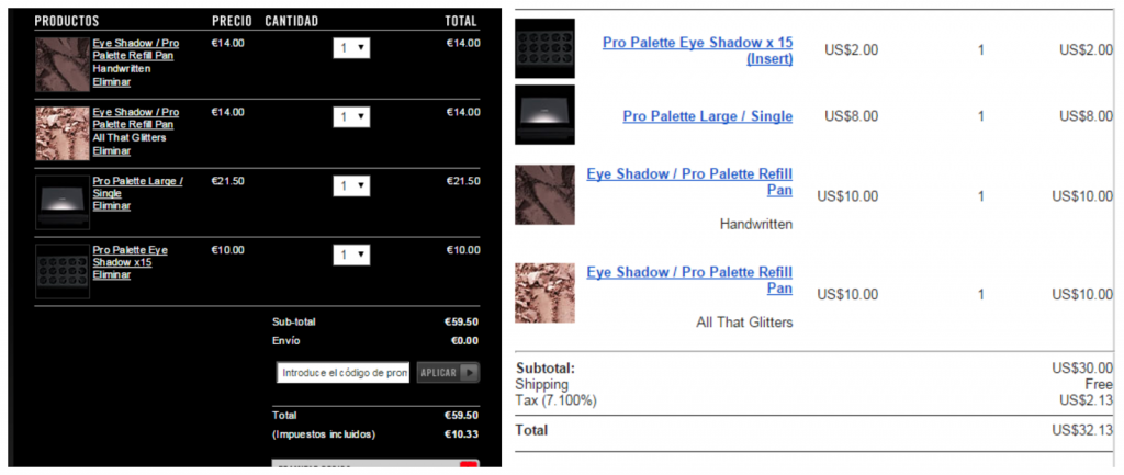 En España el pedido ascendería a 59,50€ y lo mismo en USA 32,13$ que al cambio son 25,93€!!!!! sumemos 10$ de gastos de envío de Shipito =34€ (redondeando), 26€ de diferencia aún asumiendo los gastos de envío. Todas sabemos que cada país tiene una política de impuestos, hasta ahí correcto, pero que el mismo producto véase la paleta vacía varíe de 21,50€ a 6,45€ (8$) es sangrante y ya si tenemos en cuenta que en nuestro país Mac ha subido precios recientemente es para plantearse esta alternativa muy seriamente.