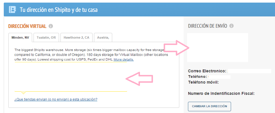 A continuación Shipito nos facilitará hasta 4 direcciones (3 de ellas en EEUU) tal y como veis en las pestañas de la imagen inferior. Con la primera asignada en Mac salían gratis los gastos de envío, sino es cuestión de mirar la más económica. Ésta dirección será la que tengamos que facilitar en la web en la que hagamos la compra, en mi caso Mac USA. Únicamente podéis tener problema al especificar vuestro número de móvil pero añadís prefijo de España y listo!