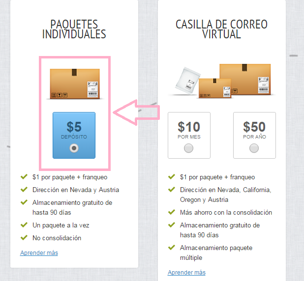 La web de Shipito tiene la opción de idioma español así que no temáis problemas con el idioma. Al abrir la cuenta escogeremos la opción que os marco abajo, la destinada a paquetes individuales (5$) y a continuación incluiremos todos nuestros datos personales.