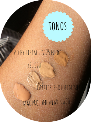 En la fotografía podéis ver una comparativa de tonos, cierto es que la Liftactiv es la más oscura, sin embargo una vez aplicada se funde muy bien con la piel, de hecho la Prolongwear de Mac una vez puesta queda mucho más anaranjada, se oxida… y es que en general las bases de MAC no terminan de convencerme con sus tonos….